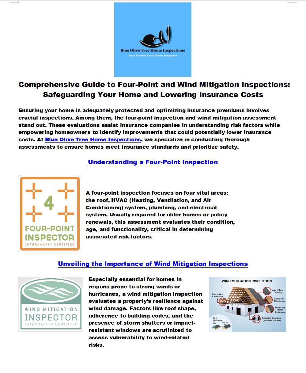Blue Olive Tree Home Inspections Your Premier Choice for Four-Point and Wind Mitigation Inspections Are you tirelessly searching for a seasoned and local home inspector skilled in Four-Point and Wind Mitigation Inspections? Do you require prompt and thorough property inspections? Look no further because we've got you covered! At Blue Olive Tree Home Inspections, we take immense pride in being your ultimate solution for a wide range of inspection services, including: Residential Insurance-Related Inspections: Roof Certification: Our meticulous inspections and certifications assure the quality and integrity of your roof, a crucial factor for insurance approval. Learn more about our competitive pricing for this service. Four-Point Inspections: Our specialized Four-Point Inspections dive deep into critical components, encompassing the roof, electrical, plumbing, and HVAC systems. This is particularly vital for older properties seeking insurance coverage. Don't hesitate, book your thorough Four-Point Inspection today. Wind Mitigation Inspections: Our expertise lies in evaluating your property's wind-resistant features, potentially resulting in lower insurance premiums. Ensuring your home can withstand Florida's unpredictable storms is our priority. Explore our extensive service area to see where we've made a difference. Comprehensive Residential Property Inspections: Whether you're buying or selling a property, our detailed inspections provide you with a comprehensive understanding of its condition. Our inspection reports have been instrumental in countless real estate transactions. To discover more about our experience and commitment, visit our About Us page. FAQ: We understand that you may have questions about our services. Explore our FAQ section for answers to common inquiries. When you choose Blue Olive Tree Home Inspections, you're selecting professionalism, attention to detail, and expertise that set us apart. Reach out to us today to schedule your inspection and experience firsthand the peace of mind that comes with our meticulous inspection services. Your satisfaction is our top priority! Welcome to Blue Olive Tree Home Inspections! Your trusted source for comprehensive property assessments. Our Services 🏡 4 Point Inspection 🏡 Wind Mitigation Inspection 🏡 Insurance Inspection 🏡 Home Insurance Inspection 🏡 Property Insurance Inspection 🏡 Insurance Inspection Report 🏡 Insurance Inspection Services 🏡 Insurance Inspection Requirements 🏡 Insurance Inspection Checklist 🏡 Insurance Inspection Company 🏡 Insurance Inspection Cost 🏡 Insurance Inspection for Mortgage 🏡 Insurance Inspection for New Homeowners 🏡 Insurance Inspection Process 🏡 Insurance Inspection Certificate 🏡 Insurance Inspection Guidelines 🏡 Insurance Inspection Form 🏡 Citizens Insurance Inspections 🏡 Citizens Property Insurance Inspections 🏡 Citizens Insurance Inspection Requirements 🏡 Citizens Insurance Inspection Guidelines 🏡 Insurance Inspections for Citizens Policyholders 🏡 Citizens Insurance Inspection Process 🏡 Citizens Insurance Inspection Report 🏡 Citizens Insurance Inspection Checklist 🏡 Citizens Insurance Inspection Company 🏡 Citizens Insurance Inspection Cost 🏡 Citizens Insurance Inspection Coverage 🏡 Citizens Insurance Inspection Discounts 🏡 Insurance Inspections for Citizens Homeowners 🏡 Citizens Insurance Inspection for New Policies 🏡 Citizens Insurance Inspection for Renewals 🏡 Citizens Wind Mitigation Inspection 🏡 Citizens Roof Inspection 🏡 Citizens Electrical Inspection 🏡 Citizens Plumbing Inspection 🏡 Citizens Home Inspection Discounts 🏡 "Citizens Insurance Inspections in Florida" 🏡 "Property Inspection Services for Citizens Insurance" 🏡 "Citizens Insurance Inspection Requirements" 🏡 "Insurance Inspection Guidelines for Citizens Policyholders" 🏡 "Citizens Insurance Inspection Report Tips" 🏡 "How to Get Inspection Discounts with Citizens Insurance" 🏡 "Wind Mitigation Inspection for Citizens Insurance" 🏡 "Roof Inspection for Citizens Property Insurance" 🏡 "Electrical Inspection Requirements for Citizens Insurance" 🏡 "Plumbing Inspection for Home Insurance Discounts" 🏡 "Citizens Insurance Inspection Process Explained" 🏡 "Why Citizens Policyholders Need Home Inspections" 🏡 "Citizens Insurance Inspection Cost Savings" 🏡 "Citizens Property Insurance Renewal Inspections" 🏡 "Choosing the Right Inspectors for Citizens Insurance" Why Choose Us? 🔍 Detailed Reports ✅ Certified Inspectors 💼 Owner/Operator/Inspector 📊 Compliance with Industry Standards 🌐 Online Visibility Enhancement 💰 Maximizing Insurance Cost-Efficiency 🔧 Home Safety and Resilience Enhancement Contact Us Ready to secure your home and enjoy peace of mind while saving money on insurance? Reach out to Blue Olive Tree Home Inspections today! 📞 Call us at 727-275-3760 📧 Email us at [email protected] 🌐 Visit our website at www.botinspections.com Don't Miss Our Exclusive Offer! Book now and take advantage of our special pricing: $100 Four-Point Inspection $100 Wind Mitigation Inspection 💥 $150 Combo Inspection (4-Point + Wind Mitigation) Insurance Premium Reduction Beyond insurance prerequisites, our inspections enhance home safety, resilience, and unlock lasting insurance savings. Act now! When it comes to Citizens Insurance and ensuring your property meets their requirements, a thorough 4 point inspection is crucial. A 4 point inspection is a detailed assessment of your property's key systems, which include electrical, plumbing, HVAC, and the roof. It's an essential step in Citizens Property Insurance that can have a significant impact on your insurance coverage and cost. Citizens Insurance and 4 Point Inspection: Key Aspects 4 Point Inspection Overview: A 4 point inspection is a specialized assessment that focuses on critical components like electrical systems, plumbing, HV